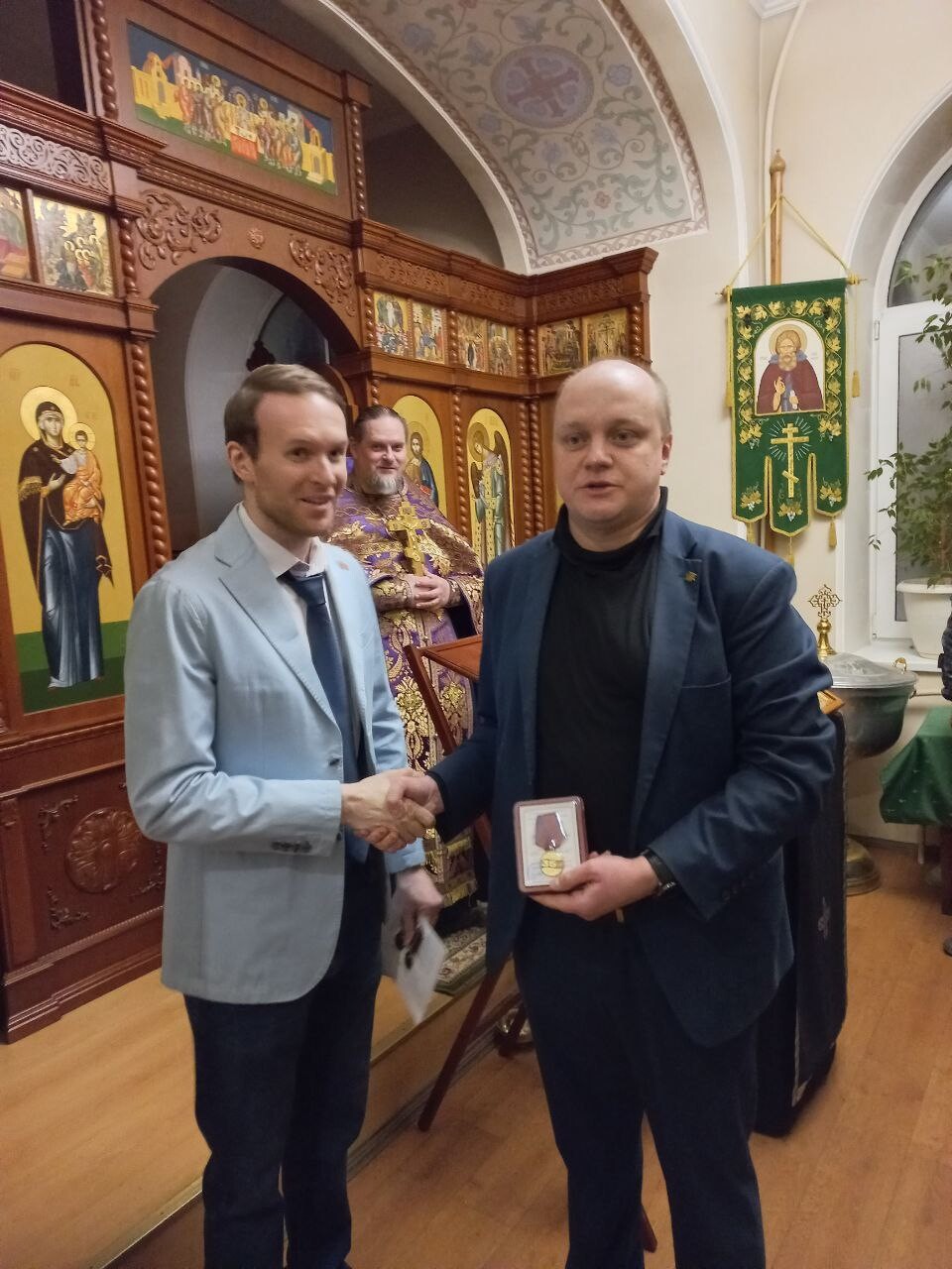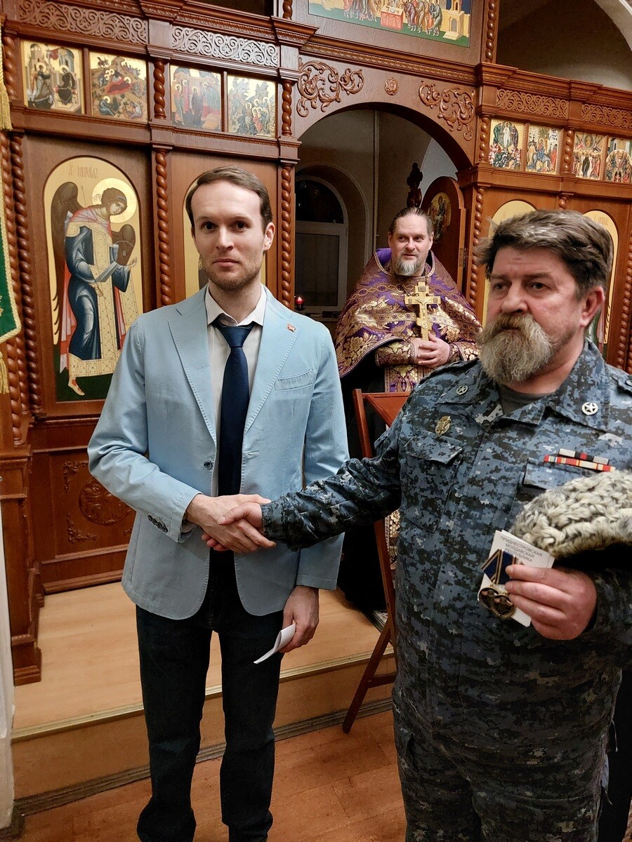 После службы Владислав Викторович вручил в торжественной обстановке медали «35 лет Приднестровской Молдавской Республике» и.о. начальника Санкт-Петербургского отдела РИС-О Бертошу Андрею Александровичу и художнику, общественному деятелю Бертош Виоле Вячеславовне, указ о награждении которых был подписан Президентом Приднестровья Красносельским Вадимом Николаевичем.